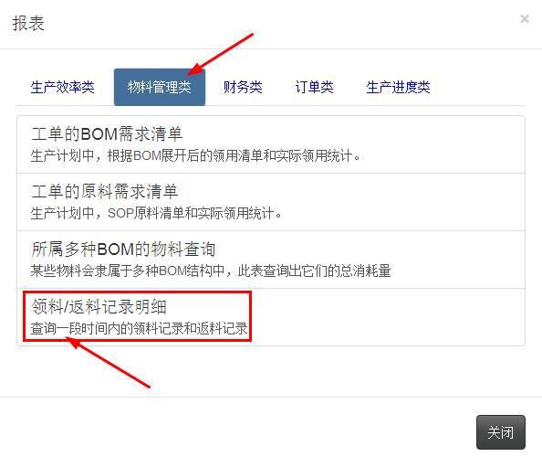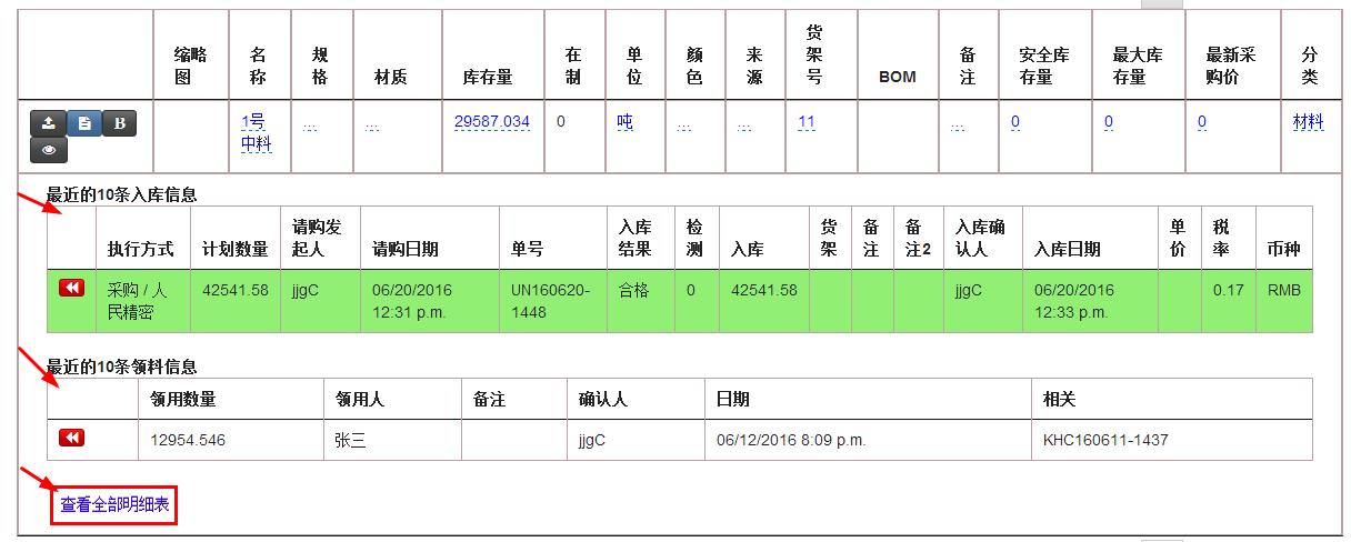 您的位置:首頁 > 培訓教程 > ERP/MES軟件基礎 速易天工MES系統如何查詢物料領用記錄 來源:通商軟件2016-10-232016-10-21 ERP系統 & MES 生產管理系統 10萬用戶實施案例,ERP 系統實現微信、銷售、庫存、生產、財務、人資、辦公等一體化管理 立即注冊免費體驗 企业的物料管控关系着企业的成本管控,速易天工MES系统中包括物料控制功能,那么如何来查询物料的使用记录呢?下面将做出介绍。 通过领料/返料记录明细报表查询 点击菜单“报表”,选择物料管理类,点击“领料/返料记录明细”,如下图 点击后会出现如下图的样子,查询的时候选择查询时间段,物料类别,报表内容可以分人或者分时间显示 具体查询某个物料的记录 进入所需要查的物料类别的页面,如下图。如果不知道物料是属于哪个类别,就在物料[全部]里查询 进入后,根据查询菜单搜索出要查询的物料名字,如下图 如上图,搜索栏输入要查询的物料名称-点击搜索-下面表格中显示查到的物料信息,然后点击小眼睛的图标,会出现下图的信息,包括入库,领用信息 如果要看更细的,点击“查看全部明细表”,会出现以下的内容,如下图 在線疑問仍未解決?專業顧問為您一對一講解 24小時人工在線已服務6865位顧客5分鐘內回復 馬上咨詢