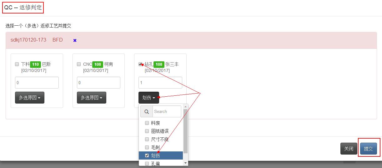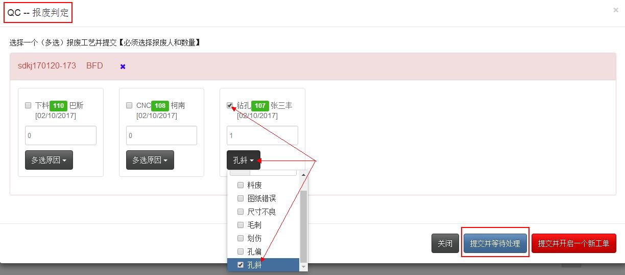在报工时的操作,结束工艺时填入不良数量及选择不良原因