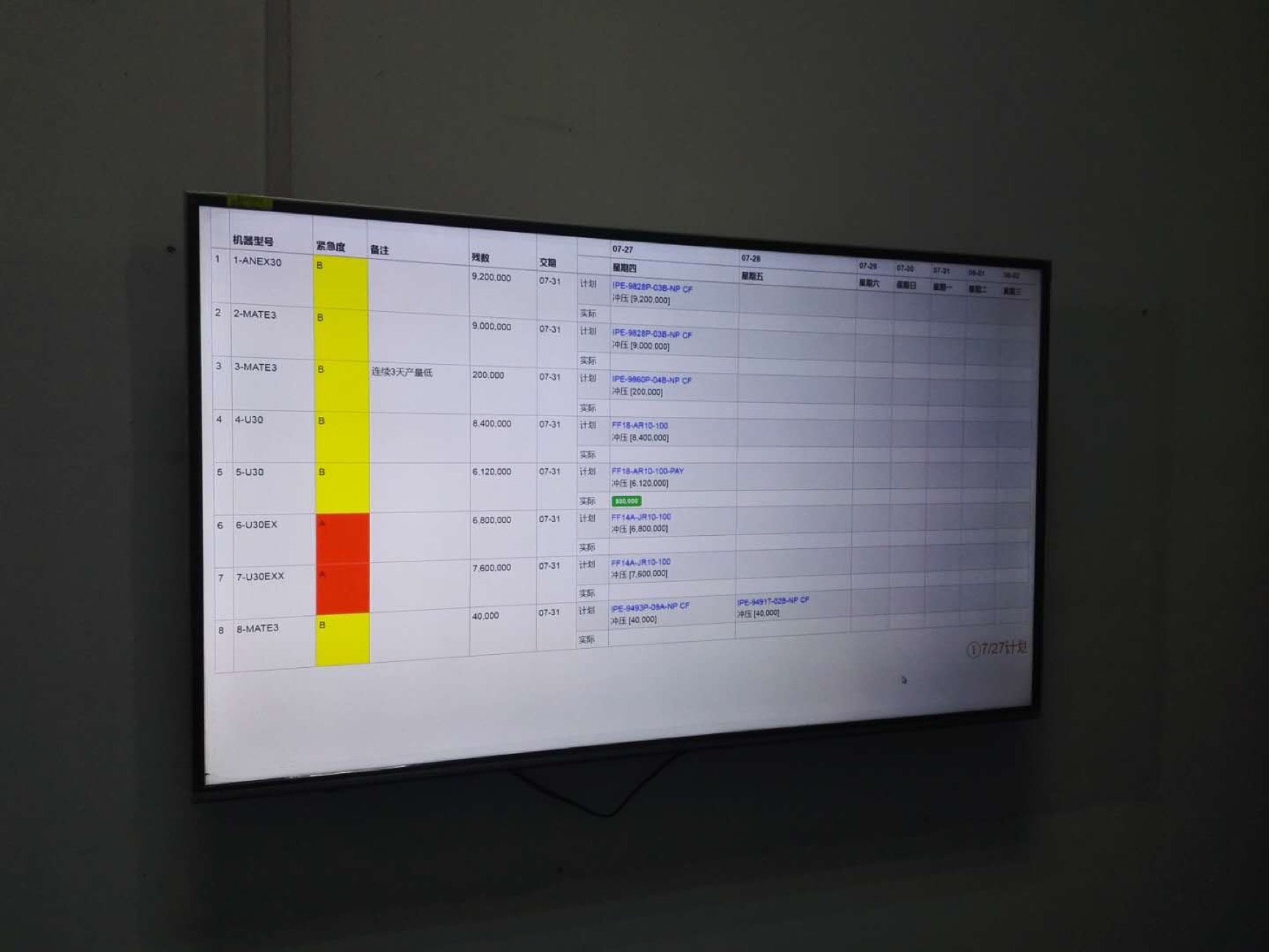 ? ? ? ? 公司產品規格種類繁多,但單個規格的產量不大,所以需要頻繁地在機臺上跟換產品。公司管理層關注計劃的安排和實際執行效果之間的比較與差異,所以它們有一張“機臺一覽表”的表格(后有照片展示)。該表格需在管理層電腦上顯示的同時也在車間通過看板顯示(后有照片展示),該公司的生產計劃和實際產出需要在這個表格里實時更新。